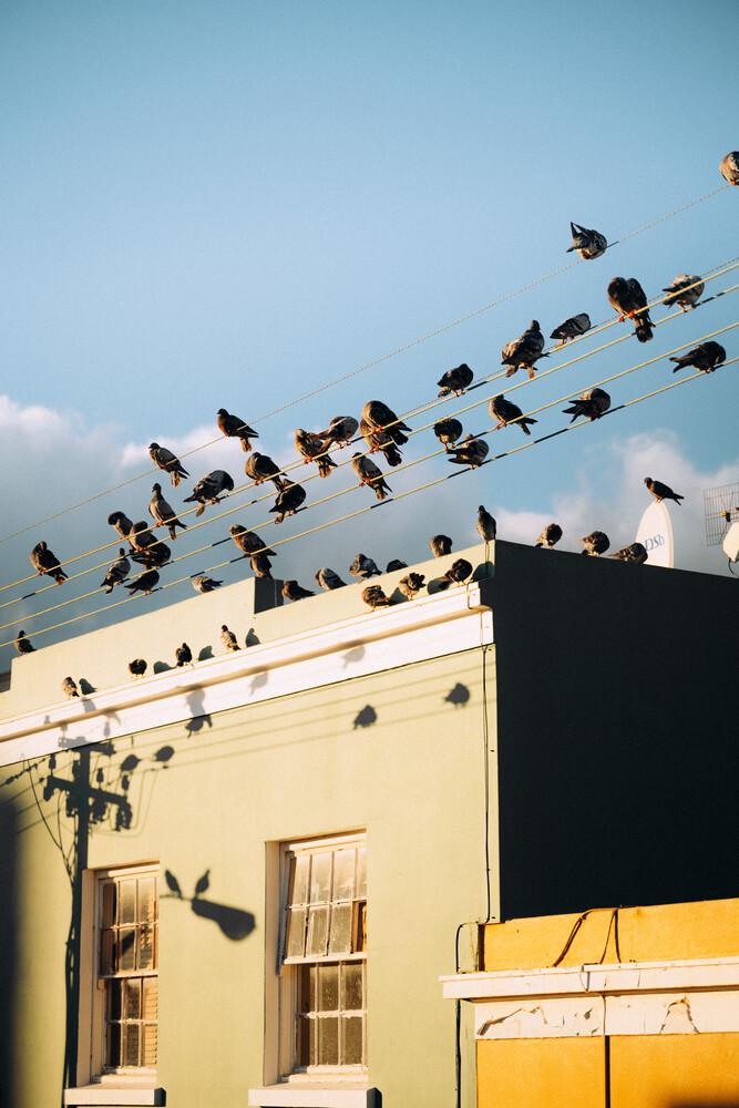 Birds flying over houses, soft colors at sunset in Cape Town.