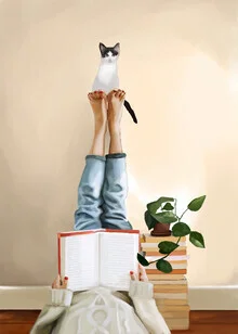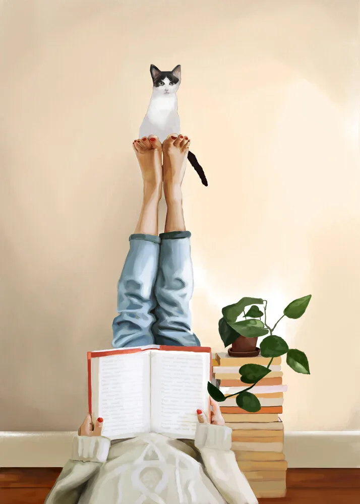 Mockup Illustration of a woman reading with her cat in a cozy room.