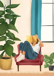 Illustration of a woman relaxing in an armchair, reading a book surrounded by plants.