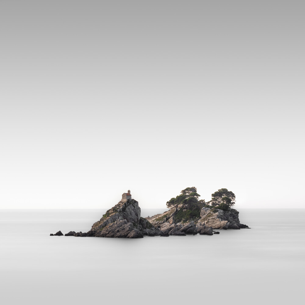 Photo art by Christian Janik: tranquil island with church in clear water of Montenegro