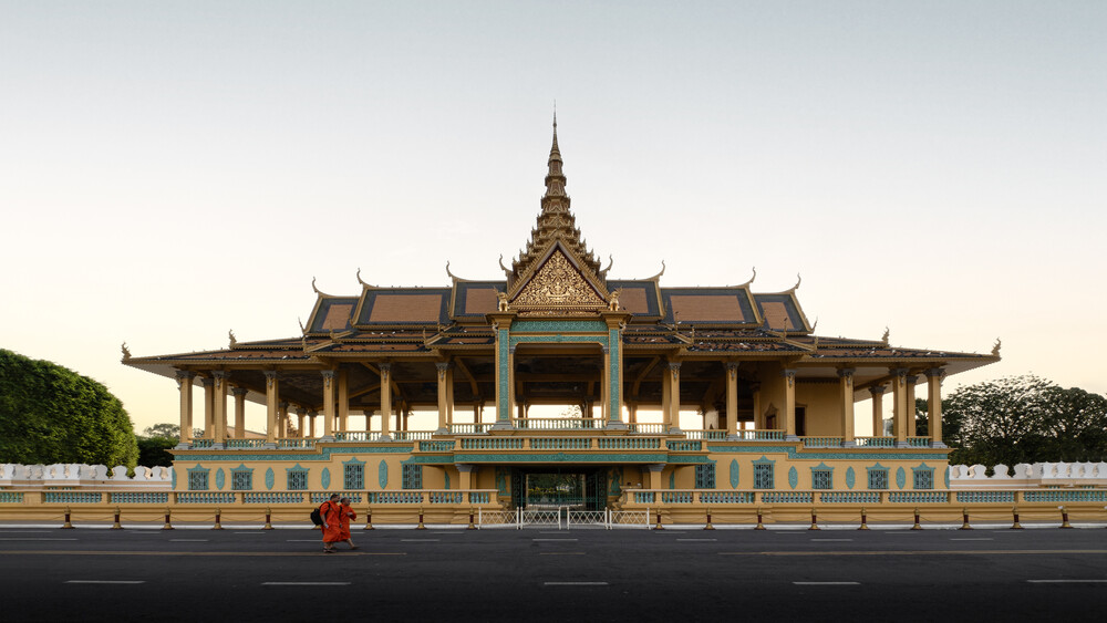 Photo art: calm capture of the Royal Palace in Cambodia with monk in the foreground.