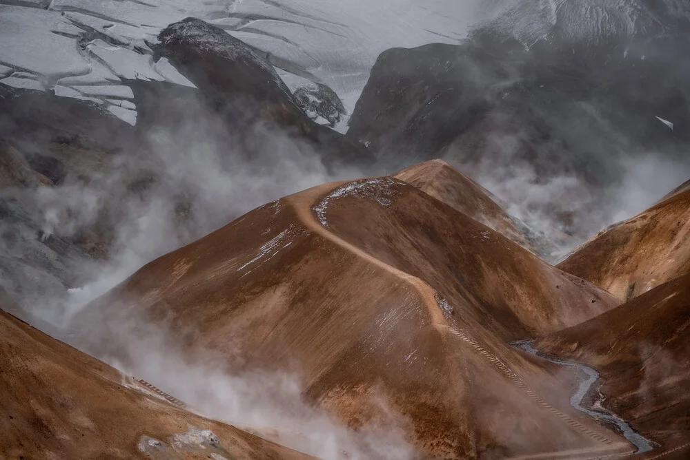 Steaming mountains in Kerlingarfjöll, Iceland, with gentle hills and a mystical sky.