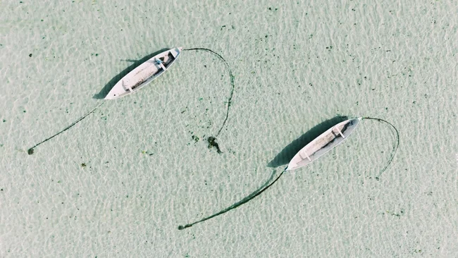 Mockup Aerial view of two boats on clear turquoise water in Indonesia
