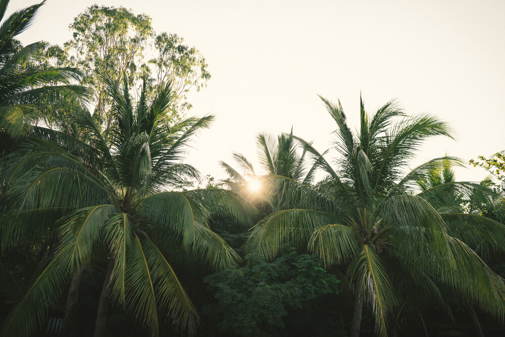 Photo art: Sunrise over Cham Island with palm trees in the foreground.