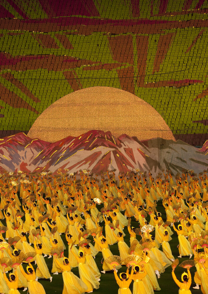 Mockup Photo art by Eric Lafforgue: Arirang mass games in North Korea during sunrise.