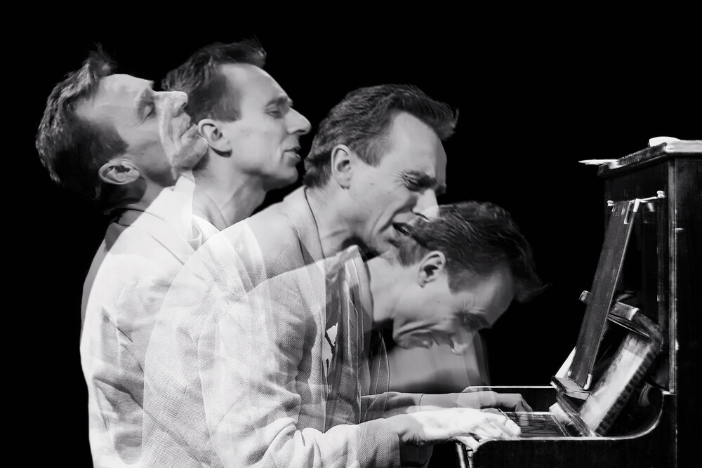 Photo art by Jake Playmo: pianist in motion, captured in black and white.