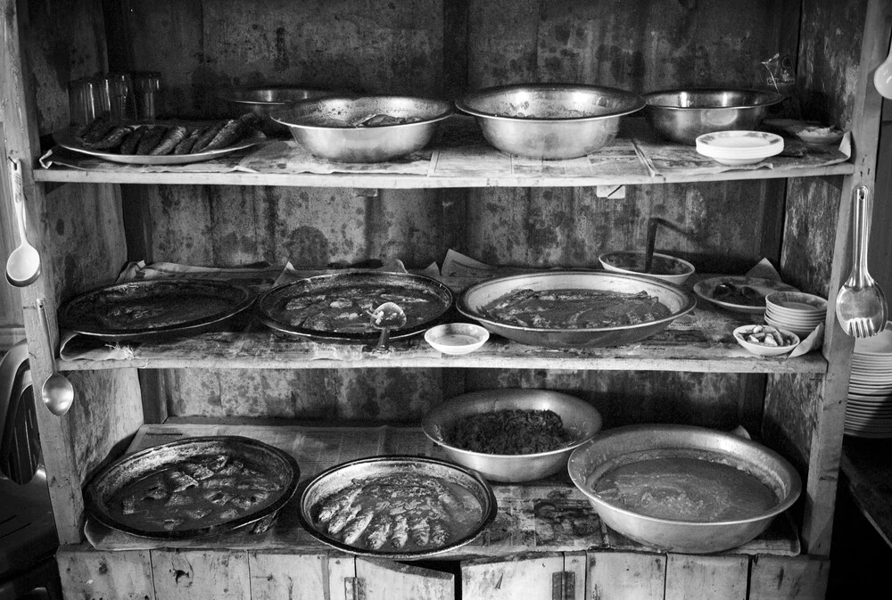 Photo art: Bowls with fish dishes in a restaurant in Kuakata, black and white image.
