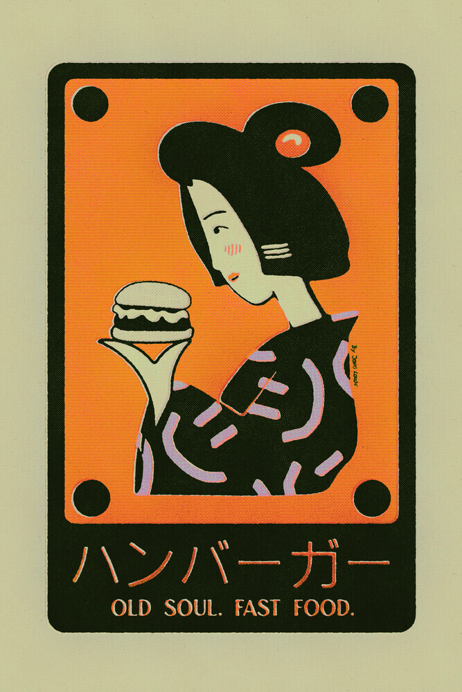 Illustration by Jonas Loose: playful depiction of a Geisha with a burger and humor.