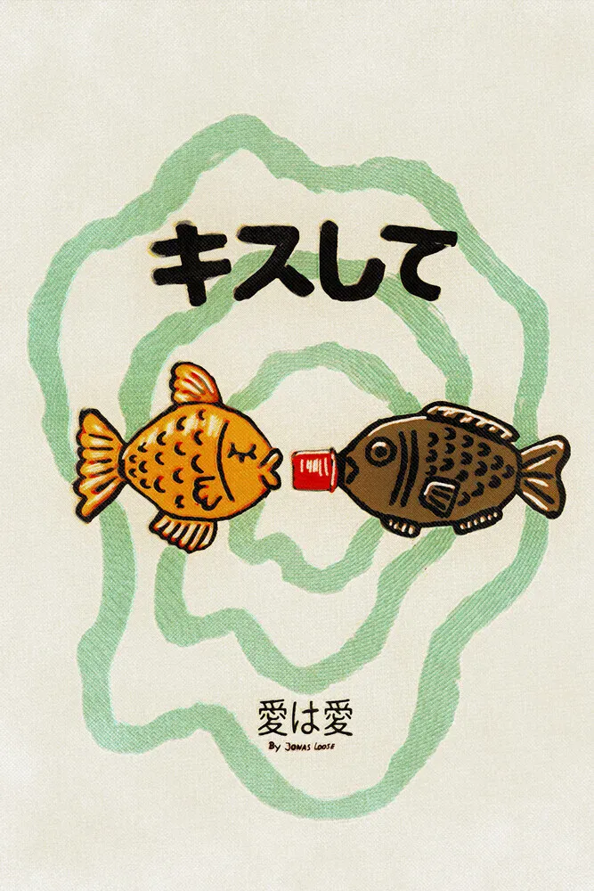 Playful illustration by Jonas Loose: sushi with soy sauce and a goldfish