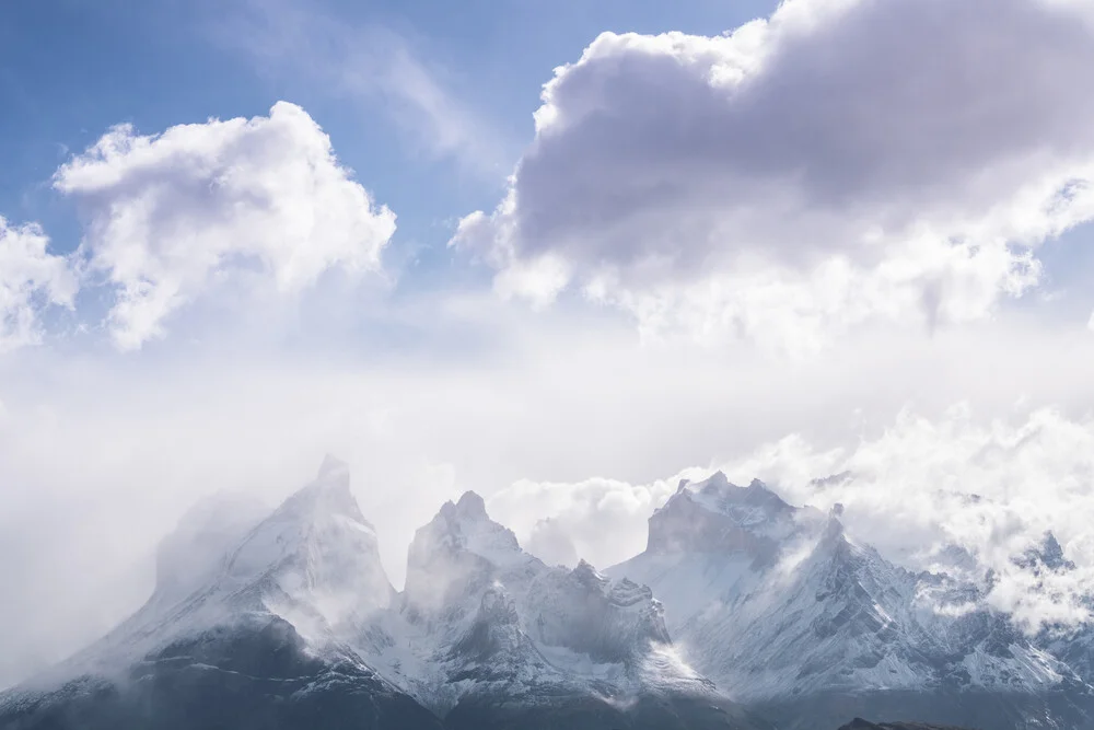 Photo art by Jordi Saragossa: snow-covered mountains in Patagonia under a blue sky