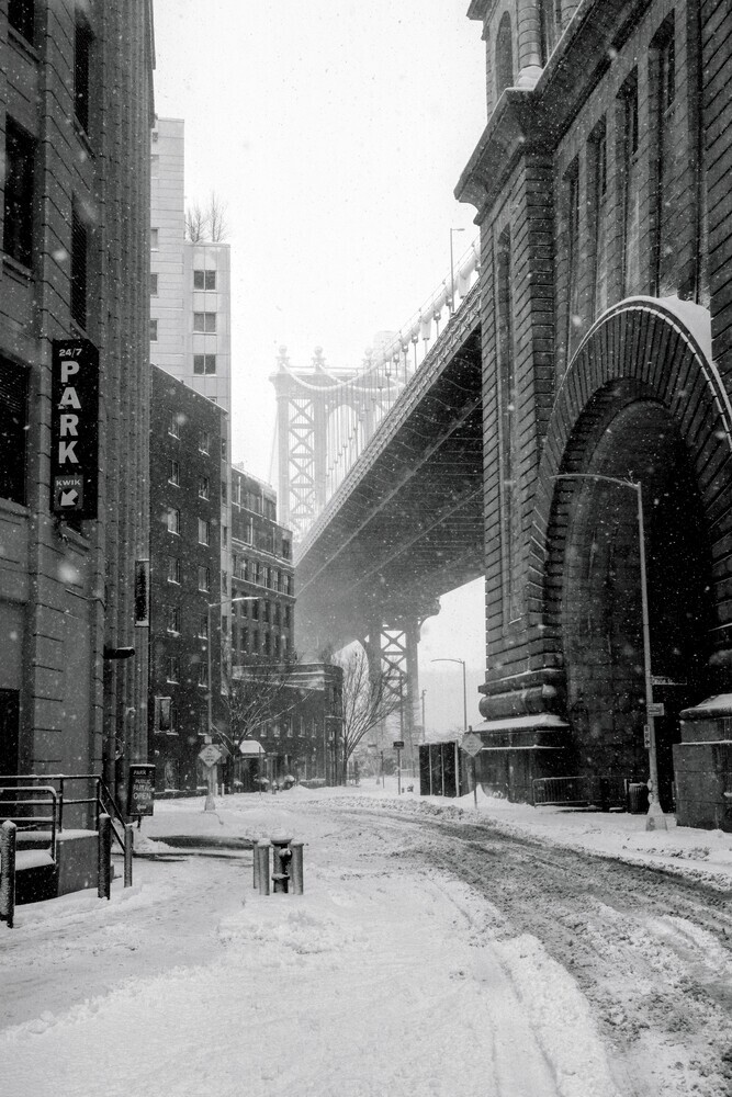 Black and white photo by Matthias Reichardt: Manhattan Bridge in the snow.