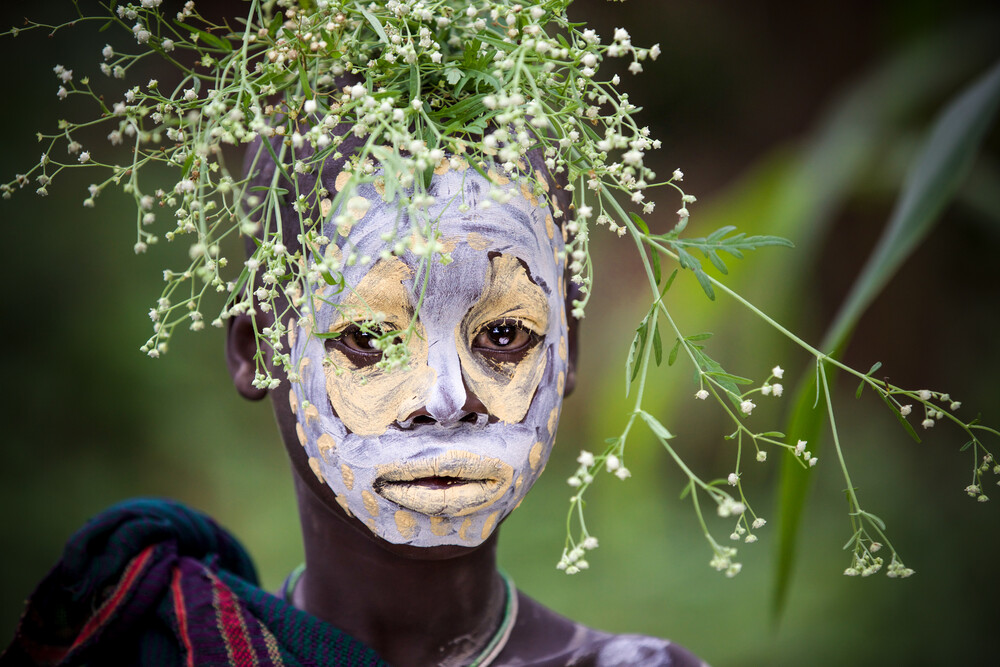 Photo art by Miro May: Woman with traditional body painting and flowers in the background