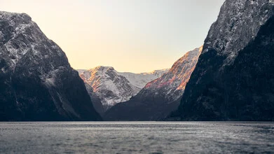 Photo art by Norbert Gräf: wintery Nærøyfjord with gentle mountains in evening light