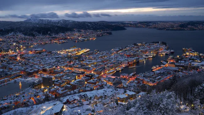 Photo art by Norbert Gräf: Bergen, Norway at blue hour by the harbor