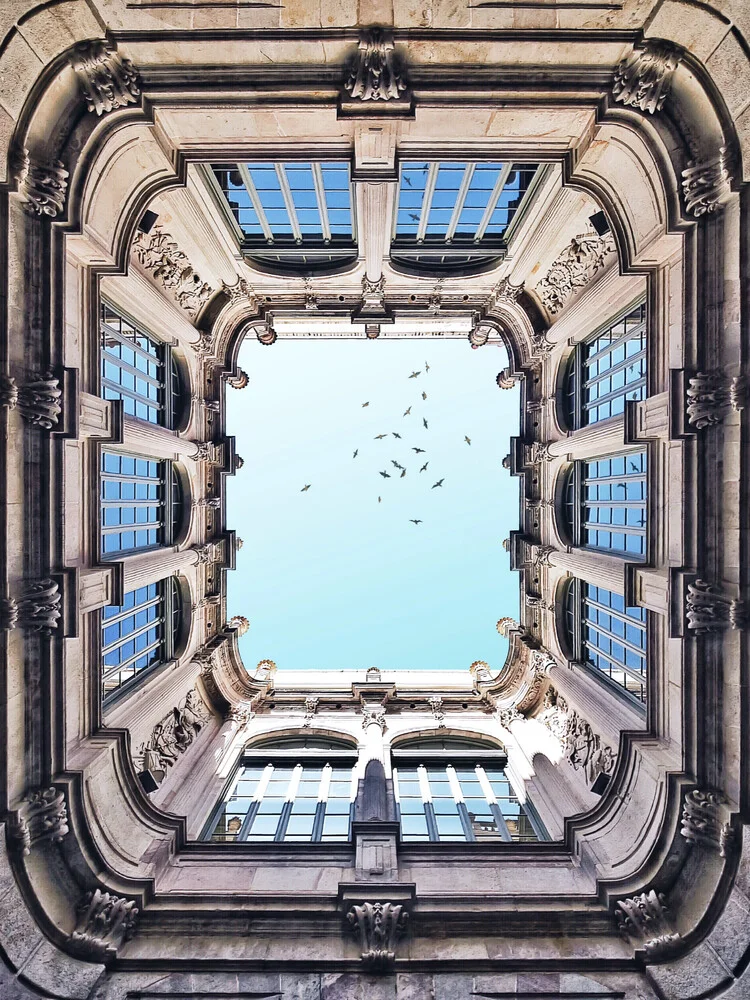Photo art by Roc Isern: Baroque frame against an urban backdrop in Barcelona.