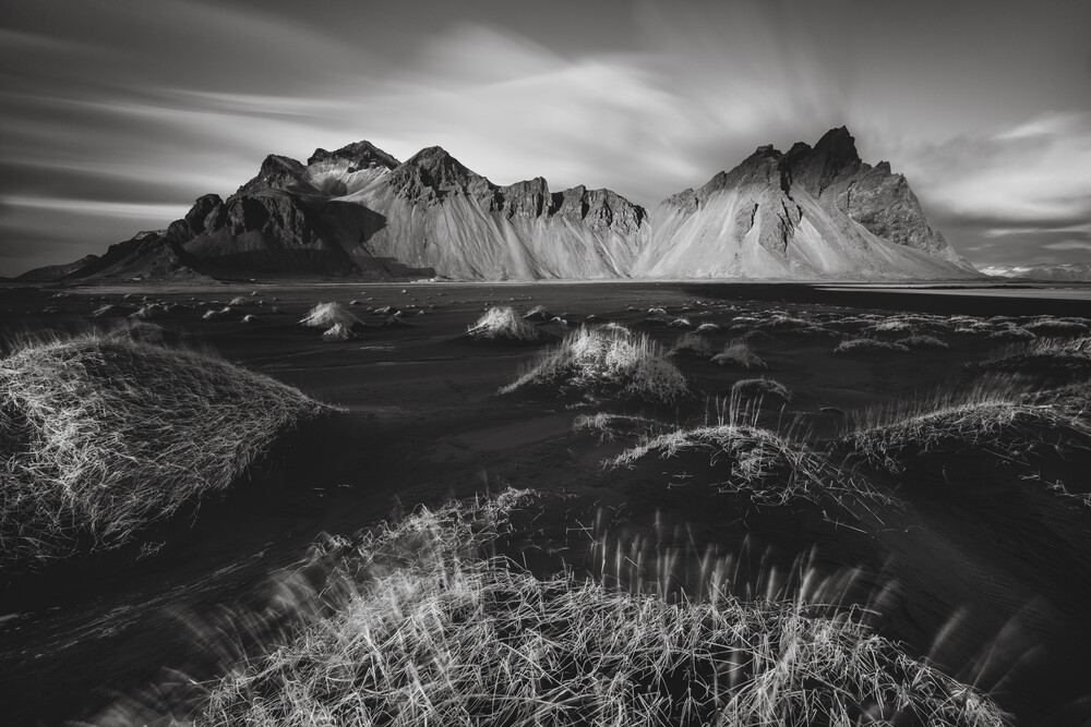 Mockup Photo art by Ronny Behnert: Vestrahorn landscape featuring contrasting light and clouds.