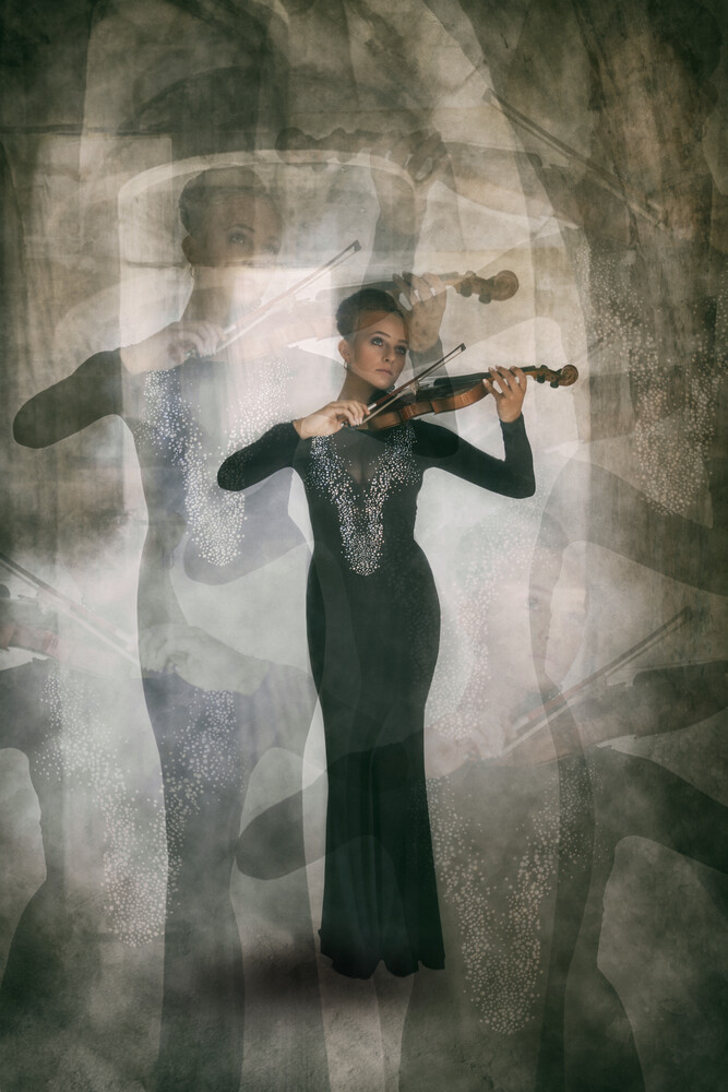 Photo art by Roswitha Schleicher-Schwarz: violinist in a festive setting by a window