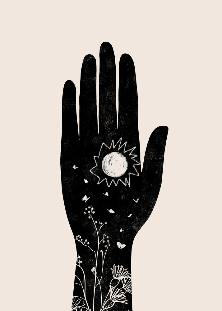 Wall art: detailed illustration of a Hamsa featuring floral elements and sun symbolism