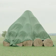 Field with hay bales in warm tones, conveying a calm rural atmosphere.