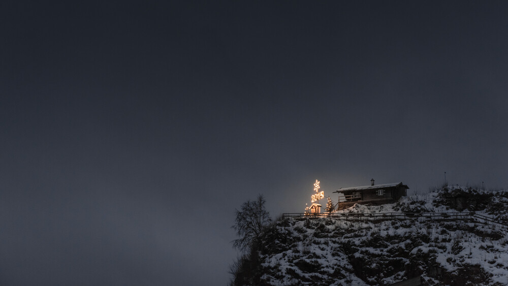 Mockup Wall art of a winter mountain village with festive lights under a dark sky