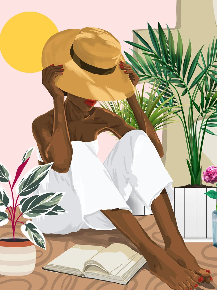 Mockup Illustration of a woman reading a book in a tropical setting.