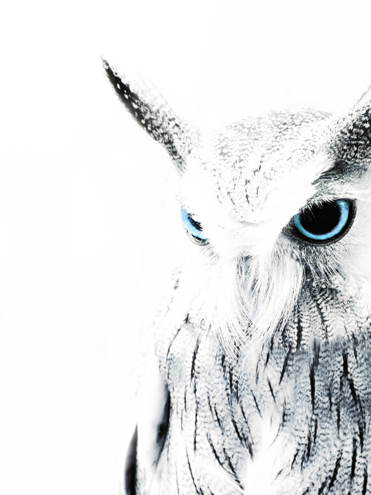 Mockup Portrait of a white owl with bright blue eyes against a dark background.