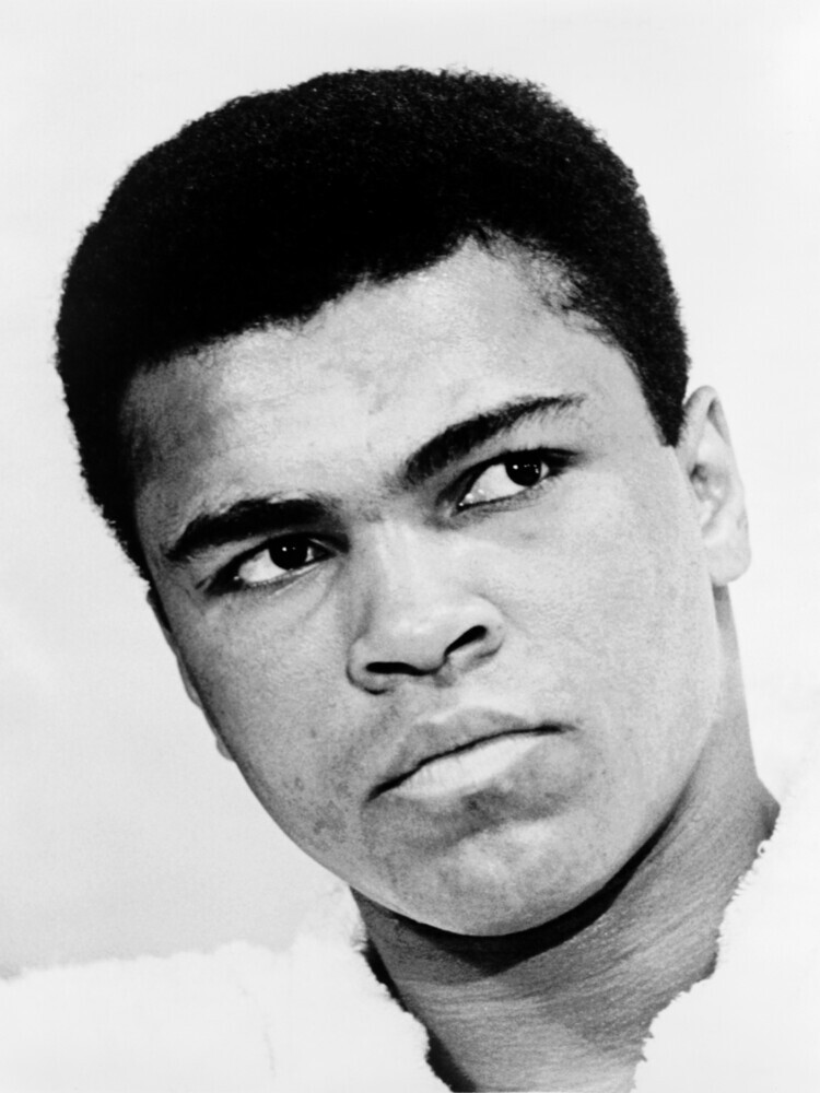 Portrait of Muhammad Ali, a legendary boxer with a friendly smile.